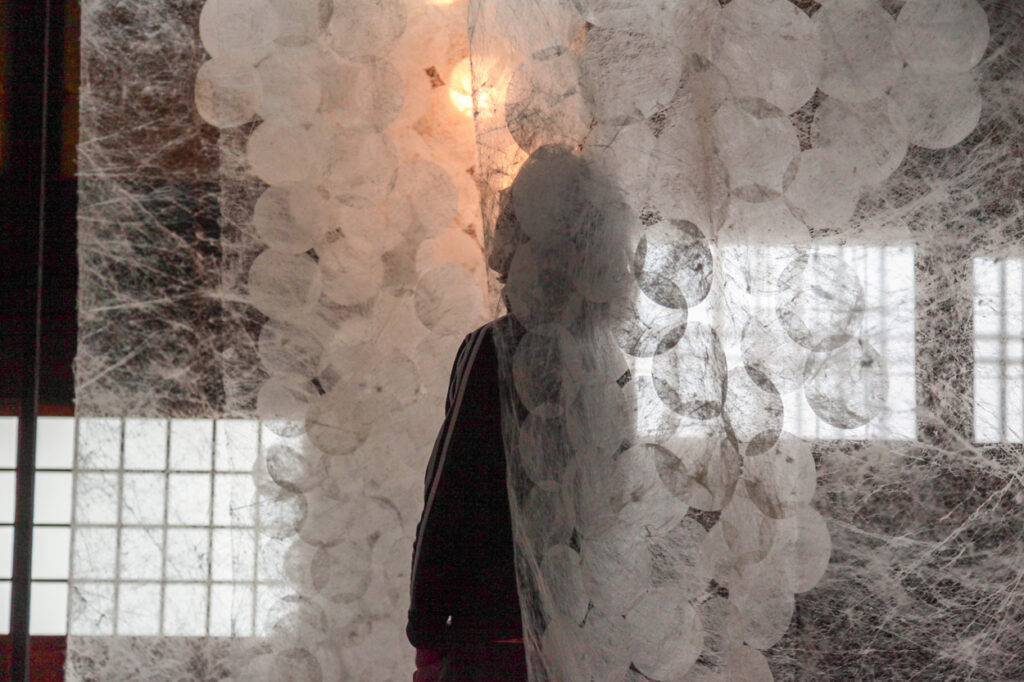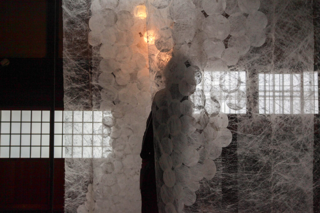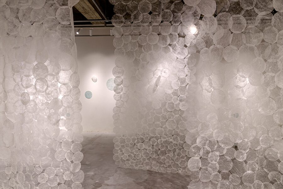 これまで、半透明であることに着目し、極細の繊維や薄い素材を使用した作品を制作してきました。半透明であることにより、光のあたり方や見る角度の違いによって、作品の見え方が大きく変わります。また、最近は影をテーマにして、真綿を使ったインスタレーション作品を制作しています。ものとそのものの影を見ることの違いはどこにあるのでしょうか。多くの場合、私たちは実際に目の前にあるものを見るとき、そのものとして見ていますが、影を見るときは、「~の影」として見ているように思えます。また、影はそこに何かがあることの証明である一方で、時には実物以上に存在感を示す時があります。実際に存在するものと影との主従関係を、視覚の不確かさを通して問い直しています。
